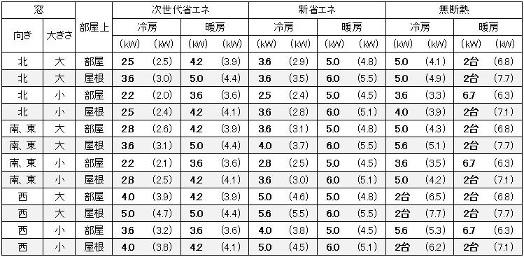もし、2部屋を1台で冷暖房したい場合は、各部屋のカッコの中の数字を足し合わせて